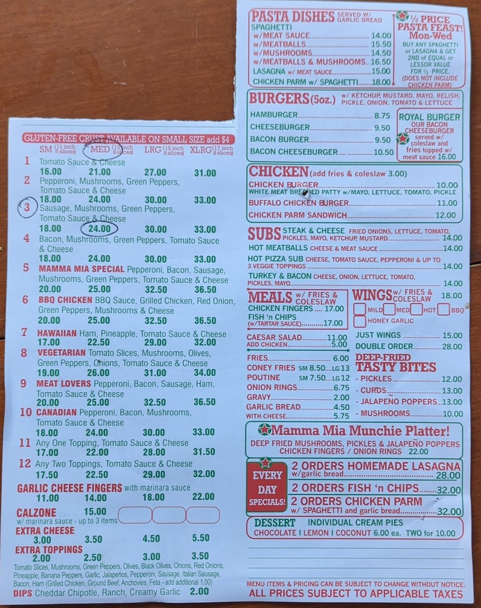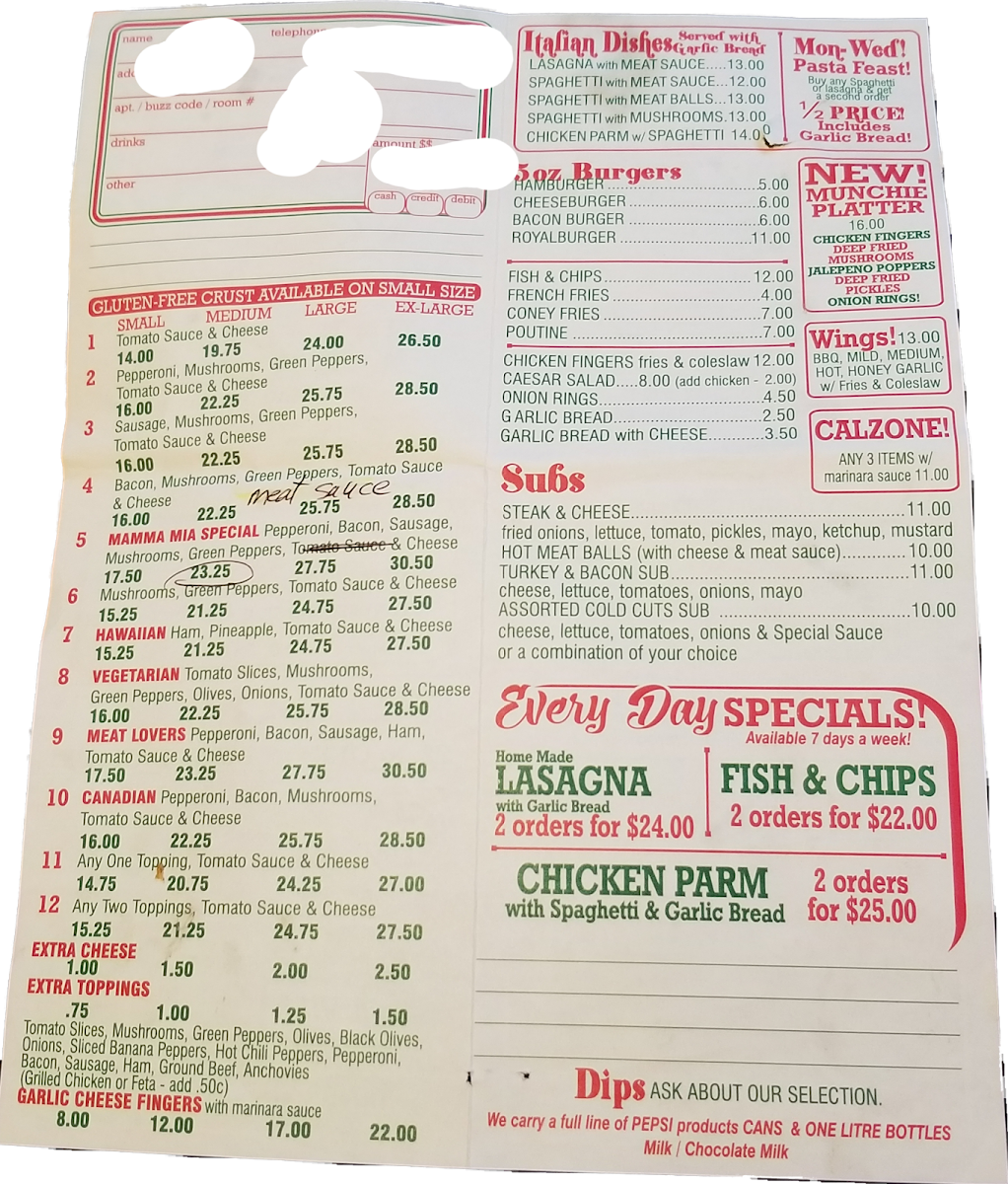 Overall, the menu at Mamma Mia Pizza offers a straightforward yet satisfying selection that balances classic comfort foods with pizza favorites. The “Every Day Specials” like Chicken Parm and Fish & Chips stand out as reliable staples, appealing to those looking for hearty, familiar dishes. The “5 Oz Burgers” section provides solid options including the Hamburger, Cheeseburger, Bacon Burger, and the more indulgent Royalburger, all of which pair well with a side of French Fries, making this category a strong choice for casual diners. Meanwhile, the pizza offerings under “Others” showcase variety, from the signature Mamma Mia Special to crowd-pleasers like the Hawaiian, Vegetarian, Meat Lovers, and Canadian, ensuring there’s something for every taste preference. While the menu keeps things simple and approachable, the absence of listed prices leaves a small gap for diners trying to gauge value in advance. Nonetheless, the combination of classic entrées, customizable burger options, and diverse pizza selections makes the menu feel well-rounded and dependable, ideal for a relaxed meal without unnecessary complexity.